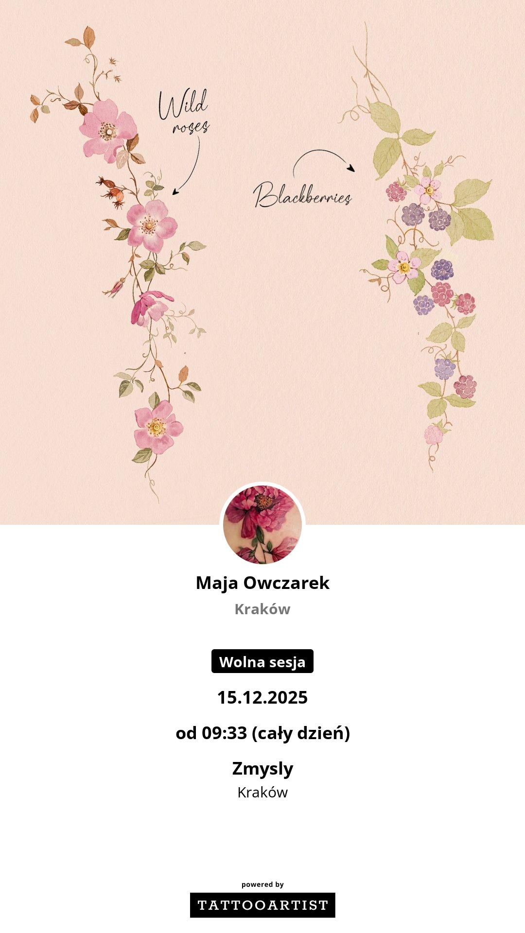 Na co dzień tatuuje w studiu Zmysły przy ul.Krowoderska39/1 w Krakowie.Wiodące motywy w moich pracach to przede wszystkim natura, rośliny, kwiaty i…